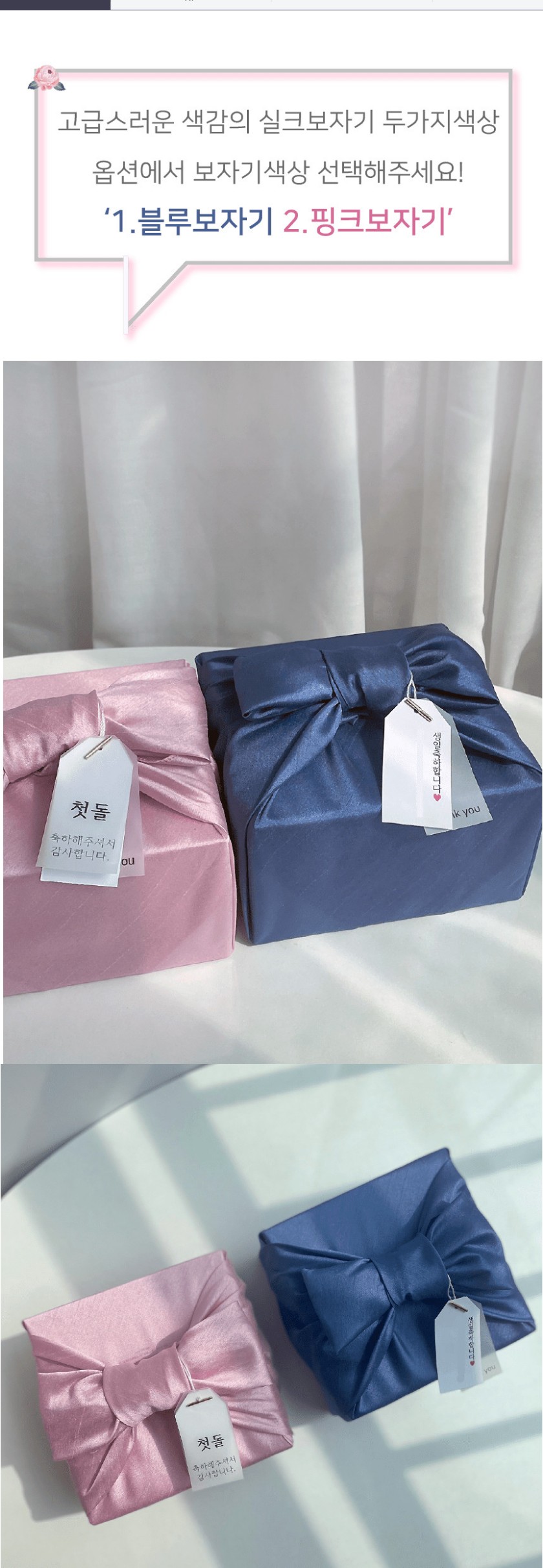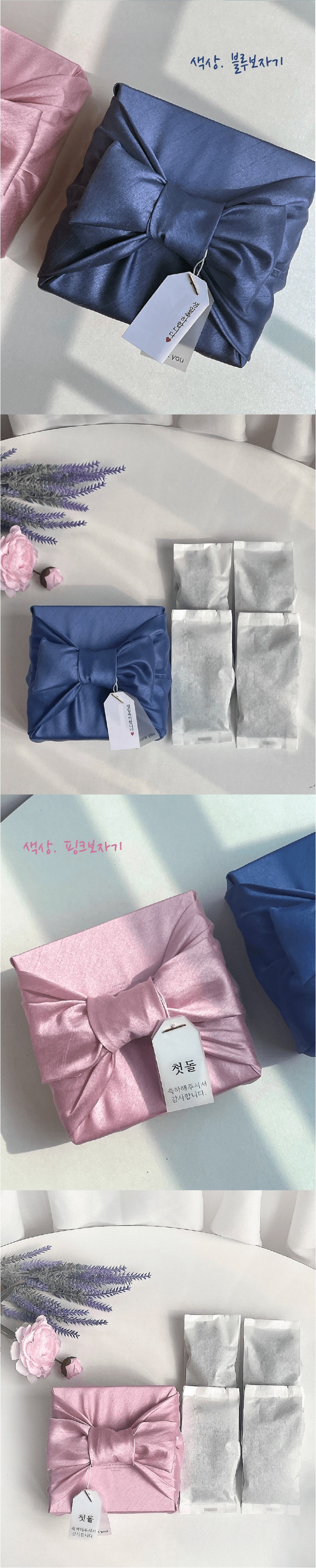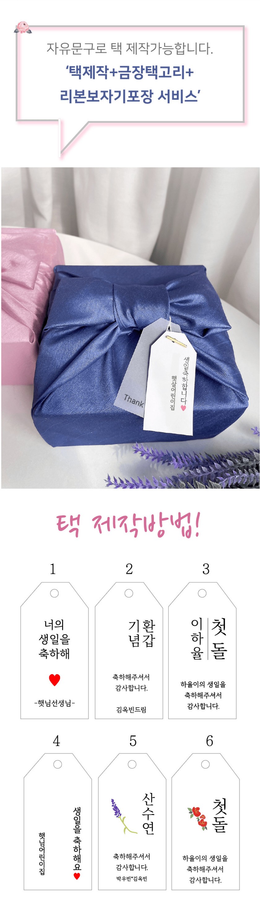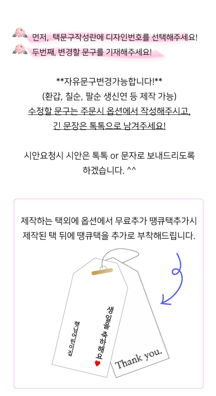 구매하기 보자기색상선택 옵션 선택 1.블루보자기 2.핑크보자기 무료땡큐택추가 옵션 선택 추가안함 땡큐택추가 택디자인번호 및 넣을 문구를 작성해주세요. 총 상품 금액 0 원 장바구니 구매하기