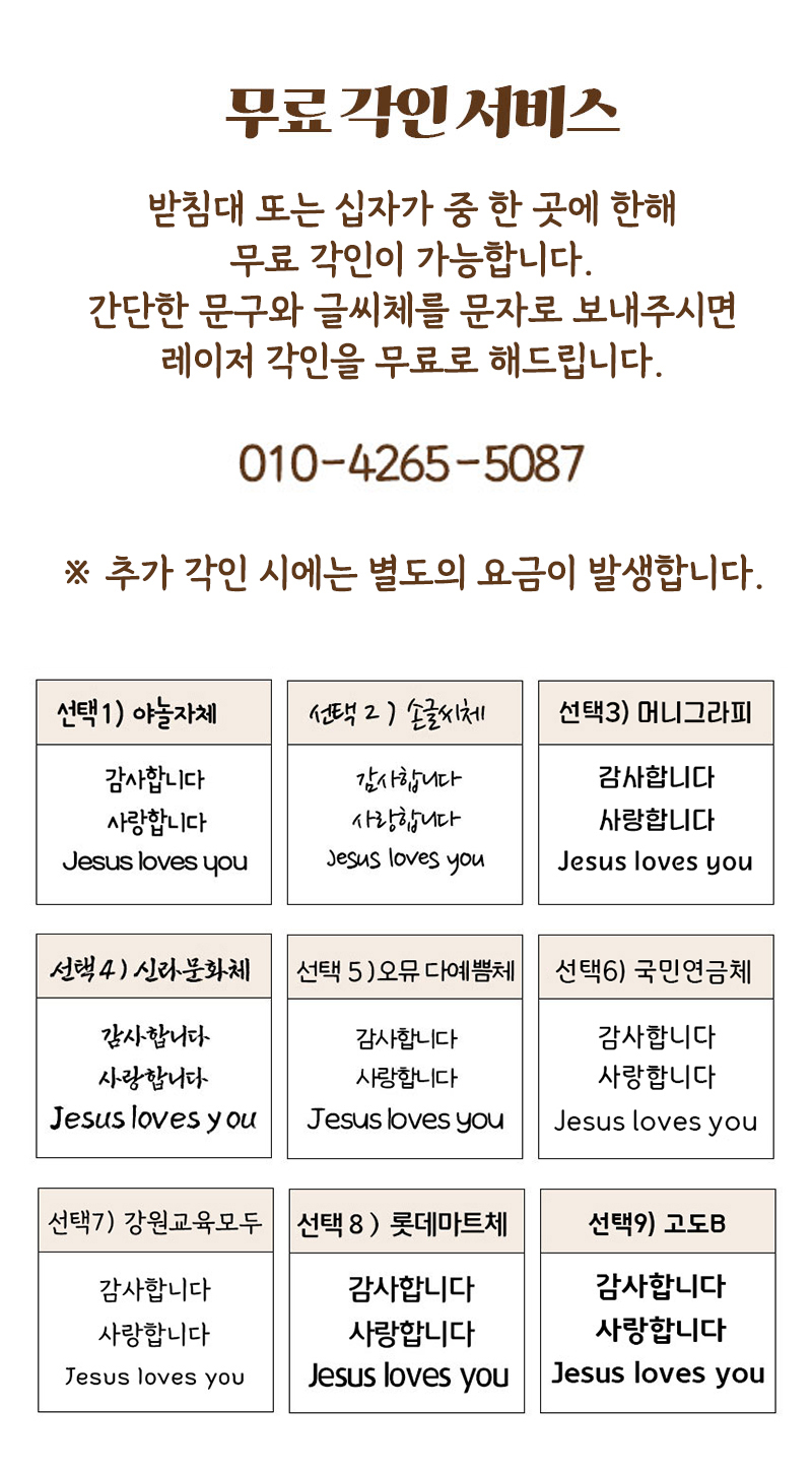 구매하기 기도손 십자가 사이즈 선택 옵션 선택 기도손 십자가 M 기도손 십자가 L 무료 각인 유무 선택 옵션 선택 무료 각인 안함 선택1) 레이저 각인 야놀자체 선택2) 레이저 각인 손글씨체 선택3)레이저 각인 머니그라피체 선택4) 레이저 각인 신라문화체 선택5) 레이저 각인 오뮤다예쁨체 선택6) 레이저 각인 국민연금체 선택7) 레이저 각인 강원교육모두 선택8) 레이저 각인 롯데마트체 선택9) 레이저 각인 고도B 여기에 각인문구 작성(예시)각인안함/푸른숲학교 입력 총 상품 금액 0 원 장바구니 구매하기