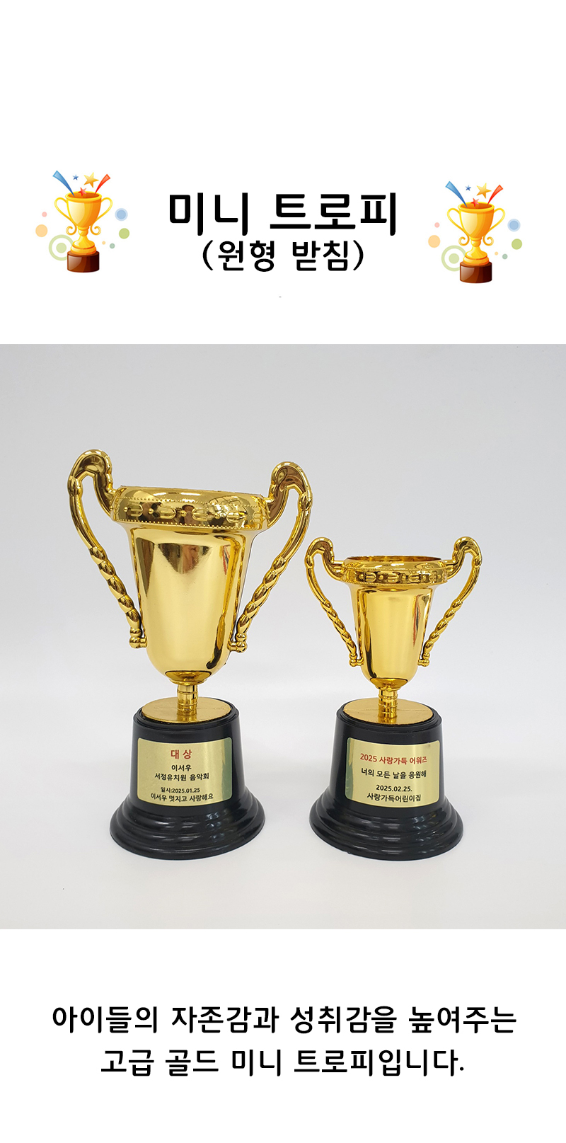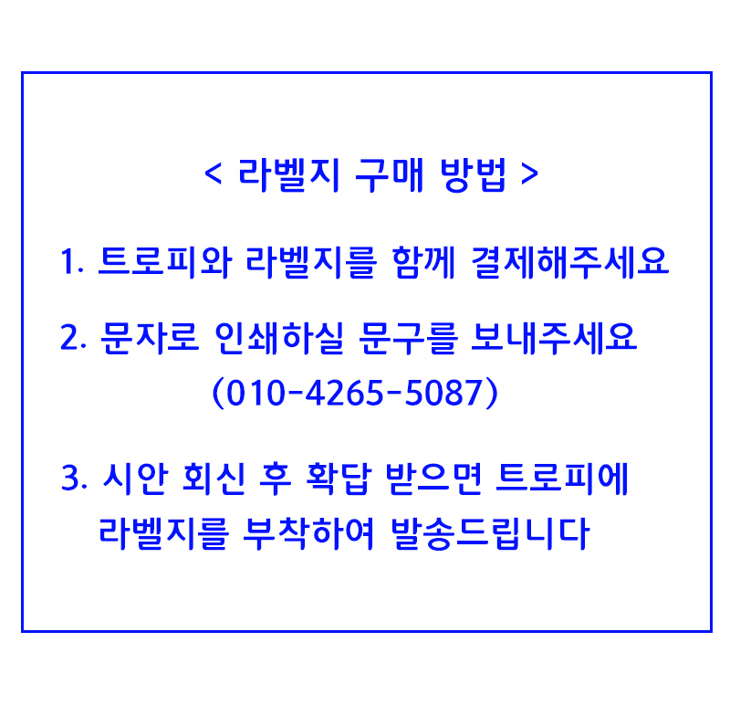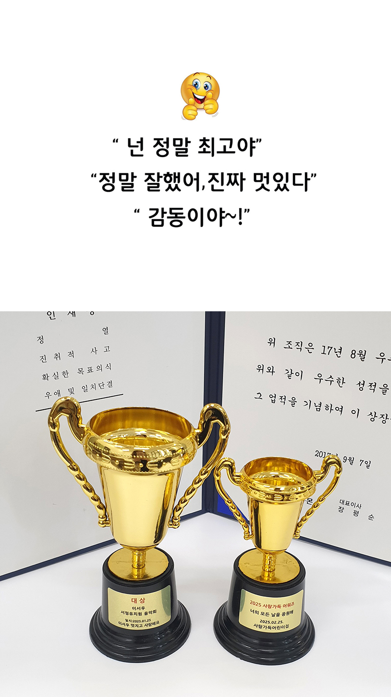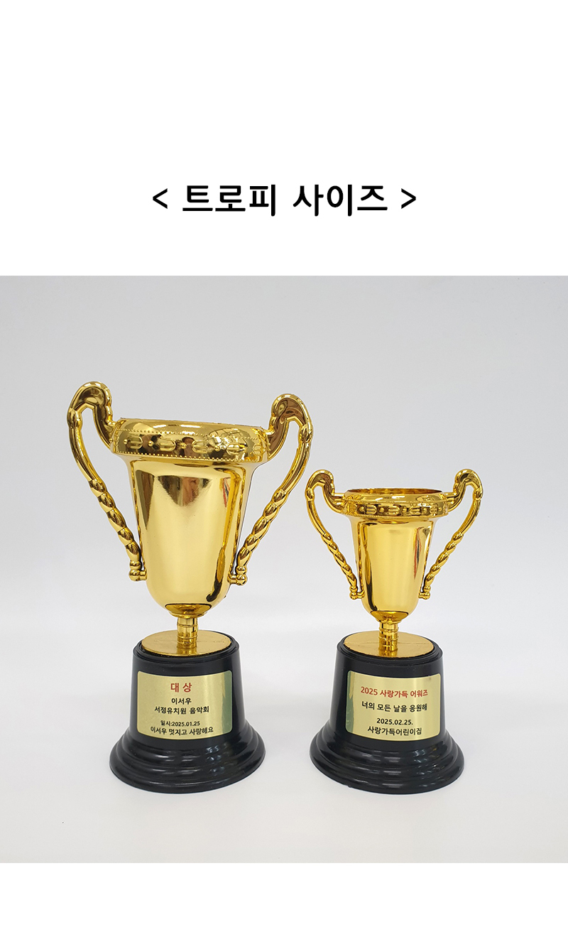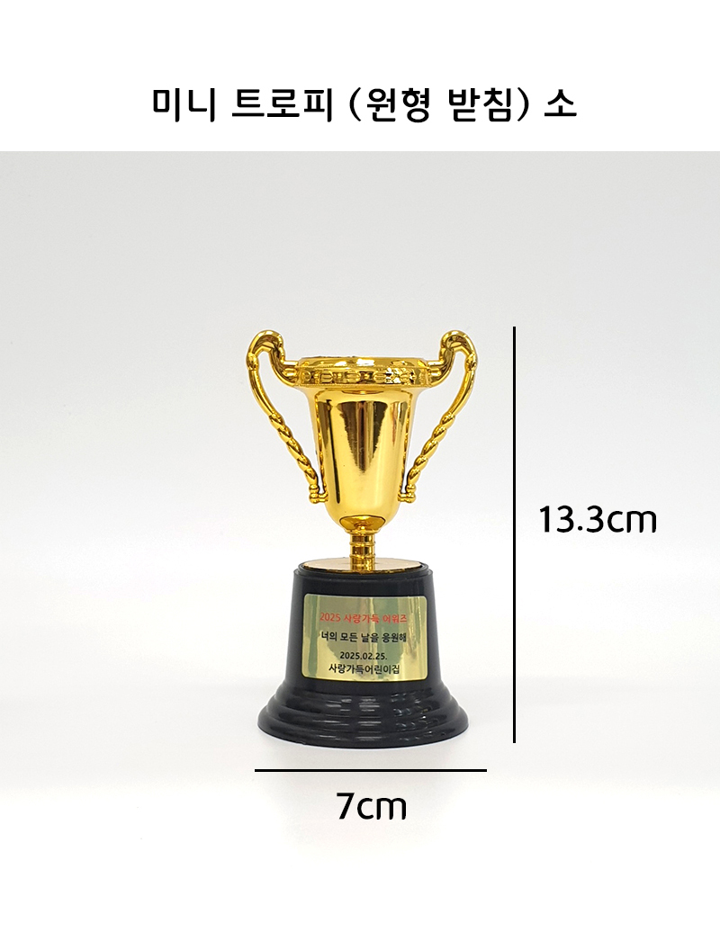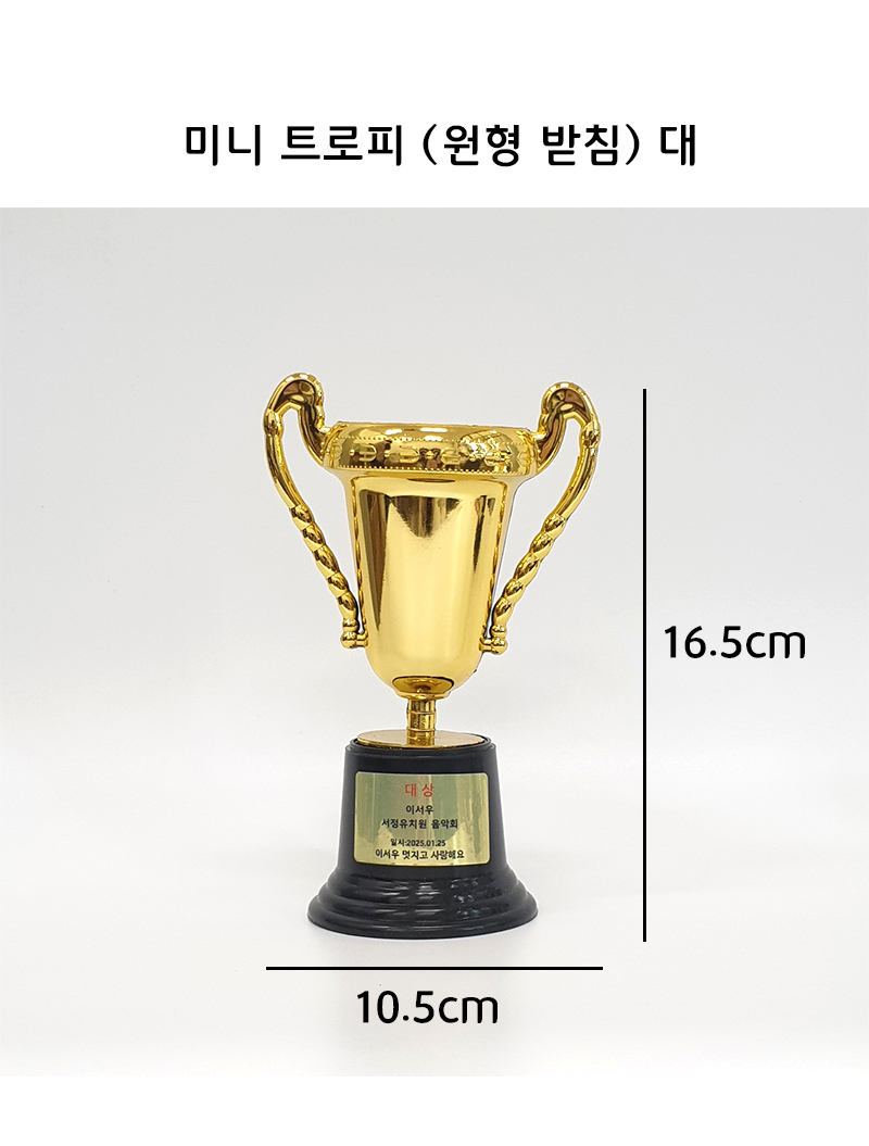 구매하기 옵션 옵션 선택 미니 트로피 (원형 받침) 소 미니 트로피 (원형 받침) 소+라벨지 1장(+700) 미니 트로피 (원형 받침) 대(+500) 미니 트로피 (원형 받침) 대+라벨지 1장(+1,200) 총 상품 금액 0 원 장바구니 구매하기