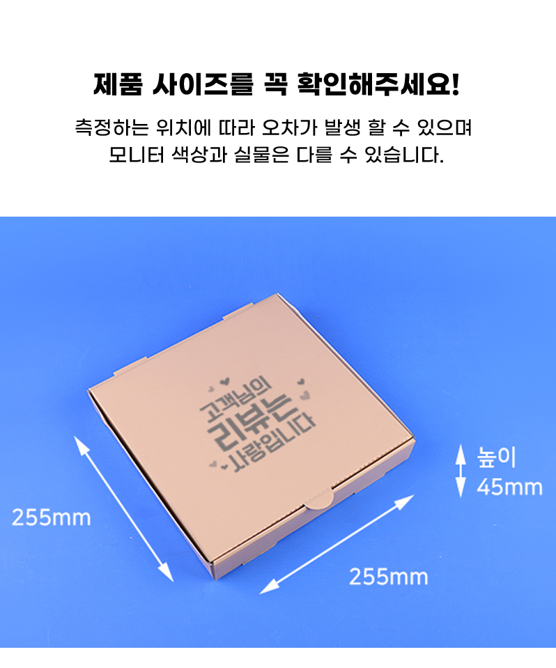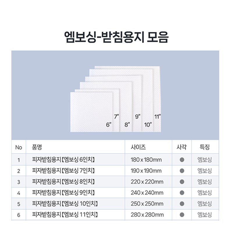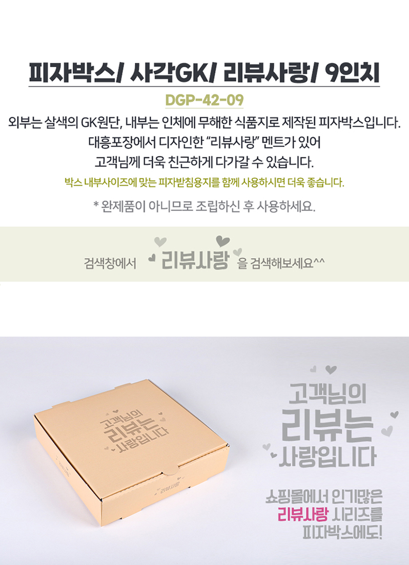 구매하기 옵션 옵션 선택 리뷰사랑 사각 9인치 피자박스 100매 + 추가 옵션 선택 피자받침(엠보싱 사각) 100매 옵션 선택 피자받침(엠보싱 사각) 100매(+4,000) 총 상품 금액 0 원 장바구니 구매하기