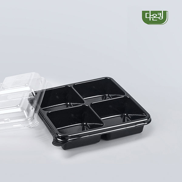 - 일회용 반찬용기 12144-4칸 흑색 600세트 죽 과일 샐러드 칸막이 포장 배달용기